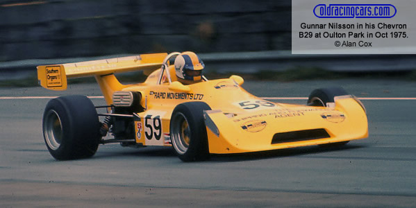 Although Brise appeared to be running away with the John Player title, Jim Crawford kept finishing second, and a win at Mallory Park in August ensured that he was still within sight of Brise right up until his Chevron retired at the last race. A string of second places was good enough to win the Southern Organs title for Ted Wentz as neither Brise nor Nilsson competed in enough races.