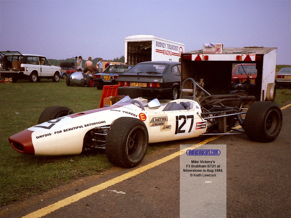 Mike Vickery raced a Brabham BT21 in 1-litre Formula 3 specification in Historic events in 1984. According to an advert for the car in 2011, it was brought back from the US to the UK in Formula B specification by dealer Bob Howlings some time around 1980 and converted to F3 specification to be raced by Vickery. It was later converted back to twin cam form for Scott Coleman, before being sold as a rolling chassis to France to run as a F3 again for driver Banakela. It came back to the UK via dealer Len Selby who sold it to Mallet. In 2006 it was acquired by Keith Norman (Windsor, Berkshire) and restored as an FB car again with a 1600cc Racing Fabrications Ford twin cam. Having raced it three times, Norman advertised it on f3historic.com in January 2011 and was next seen when raced by Sean McClurg (Greenfield, Bedfordshire) at the HSCC Brands Hatch meeting in September that year. Then to Ian Ritchie (Ramsbury, Kent) and raced in hillclimbs. Raced by Ritchie at the Loton Park Hill Climb in August 2014.
