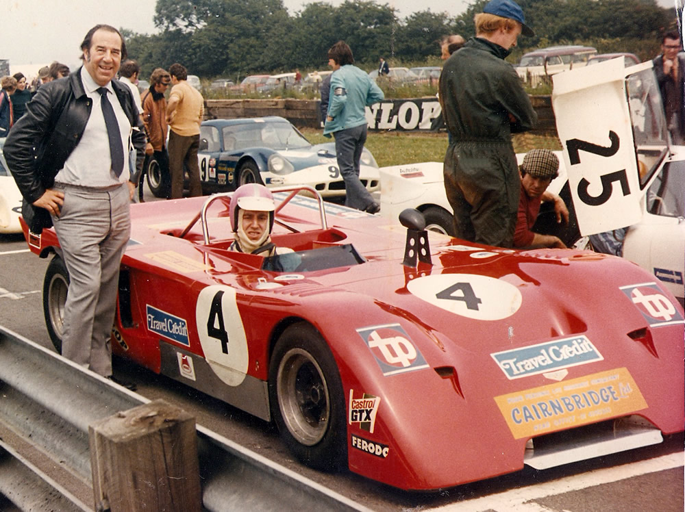Chevron B19 71-9 outisde the house of Central Garage Mirfield Ltd boss Buller Sinfield before its first race. Copyright Derrick Worthington 2011. Used with permission. (Chevron Records: 'John Lepp'). To Central Garage (Mirfield) for John Lepp to drive in European 2-litre Championship 1971: debut Croft NSCC Formule Libre race 28 Mar 1971 (MN 1 Apr 1971 p10). Also driven by Lepp at Oulton Park 9 Apr, Thruxton Yellow Pages Trophy Race 12 Apr, Paul Ricard 18 Apr (co-driven by Guy Edwards), the Paris GP sports cars 23 May, Silverstone 5 Jun, Hockenheim 4 Jul, Croft 10 July, Brands Hatch 30 Aug, Nürburgring 5 Sep, Thruxton 19 Sep, Zandvoort 26 Sep and Montlhéry 17 Oct (co-driven by Terry Croker). To James Gray to drive in European 2-litre sports car races 1972. Driven by Gray at Nürburgring Interserie race 3 Apr 1972 (MN 13 Apr 1972 p27; preview MN 30 Mar 1972 p23) where Autosport describes it as a "B19/21" and as "ex-Lepp"; at Brands Hatch BOAC 1000 kms 16 Apr 1972; Spa 1000 kms 7 May 1972 (MN 11 May 1972 pp12-14) co-driven by Lepp; Nürburgring 1000 kms 27 May 1972 (MN 1 Jun 1972 pp12-13) co-driven by Gaydon; Martini International Trophy Race, Silverstone (E2lSC R5) 18 Jun 1972 (MN 22 Jun 1972 pp8-9, AS 22 Jun 1972 pp26-30); Austrian 1000 kms (WCM R10) Osterreichring 25 Jun 1972 (MN 29 Jun 1972 pp14-17) co-driven by Gaydon; Vila Real 9 Jul 1972 (MN 13 Jul 1972 p6); Nurburgring Eifelpokalrennan 3 Sep 1972 (MN 7 Sep 1972 pp8-9). Driven by Lepp at Thruxton Motoring News/Castrol Sports/GT Cars "100 kms" 24 Sep 1972 (MN 28 Sep 1972 p6). In November 1972, Autosport (AS 16 Nov 1972 p5) reported that "the ex-John Lepp B19 of John Gray will be seen in the hands of B8 driver Ian Harrower next year". It was raced through 1973 and 1974 by Ian Harrower and James Bell plus guest drivers. Seventh at the Two Hours of Luanda in Angola 29 Jul 1973 and second at the 6 Hours of Nova Lisboa 5 Aug 1973 (AS 16 Aug 1973 p51-53). Raced as part of "Team Chevron" in a 750 MC 6-hour relay at Silverstone 30 Sep 1973 (AS 6 Oct 1973 pp40-41). Advertised by Harrower in November 1974 (AS 7 Nov 1974).