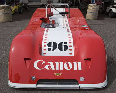 Miles Jackson's Chevron B19 restored to Canon livery in 2009. Copyright Miles Jackson 2009. Used with permission. B19-71-10A (B). The rebuilt car continued to be raced in US vintage events by Amalfitano. Sold back to Dick Leppla June 2001. To Jeff McKay (Seattle, WA) Nov 2002. To Jorgen Moller (Salt Lake City, UT) Sep 2007 ("FIA papers say 10A, chassis plate reads '10'"). For sale April 2008. Sold to Miles Jackson (Maple Valley, WA) and entered for the Portland Historics 10-12 Jul 2009.