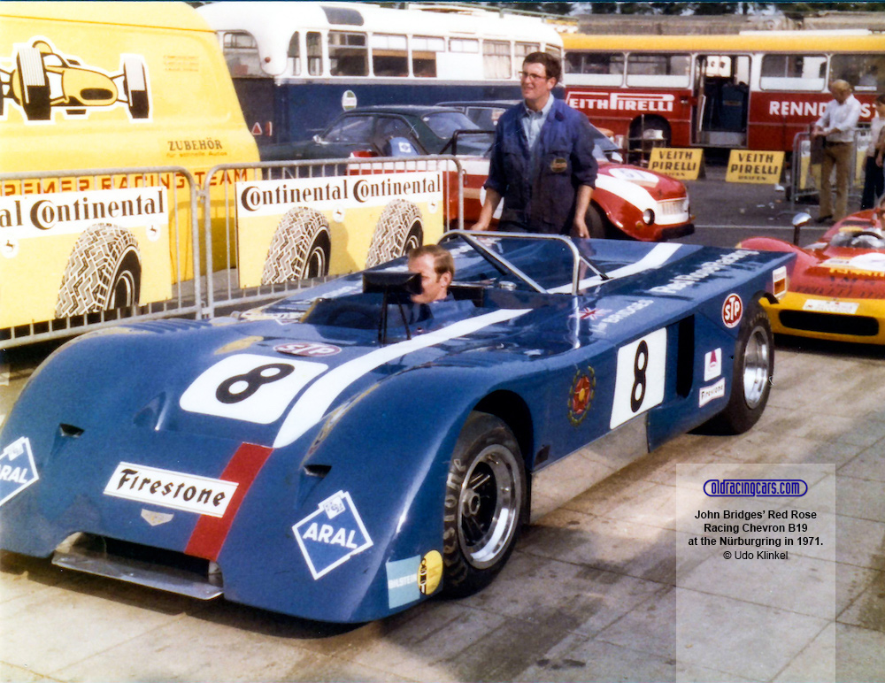 John Bridges' Red Rose Racing Chevron B19 at the Nurburgring in September 1971. Copyright Udo Klinkel 2021. Used with permission. (Chevron Records: 'John Bridges'). To Red Rose Racing for John Bridges to drive in European 2-litre Championship 1971: debut Oulton Park Mid-Cheshire MRC Sports, GT and Clubmans race 20 Mar 1971 (MN 25 Mar 1971 p14). Also driven at Paul Ricard 18 Apr by Brian Redman and Richard Attwood; at Salzburgring 23 May by Niki Lauda (MN 27 May 1971 pp6-7); then by Bridges at Silverstone 5 Jun, Trophée d'Auverne at Clermont Ferrand 20 Jun; then at Croft 10 July by Derek Bennett ('kinked the monocoque slightly in practice' and raced works car instead); by Bridges again at Brands Hatch 30 Aug, Nürburgring 5 Sep, Zandvoort 26 Sep and Barcelona 12 Oct (co-driven by Peter Gaydon). Gaydon "crashed heavily" during the race, "fracturing his leg and severely damaging the car". At Montlhéry 17 Oct Bridges' B19 is described as "not a runner" (MN 21 Oct 1971 p22). A new car (B19-71-32) was ready for Jarama 7 Nov (AS 11 Nov 1971 pp14-15) having "been built in a week following the destruction of his previous car at Barcelona". Paul Owens, one of the principals of Chevron throughout this period and the keeper of Chevron's record book, is certain that B19-19-7 did not survive. A car owned by Randall Smith in 2008 was said to be "c/n DBE 07". |