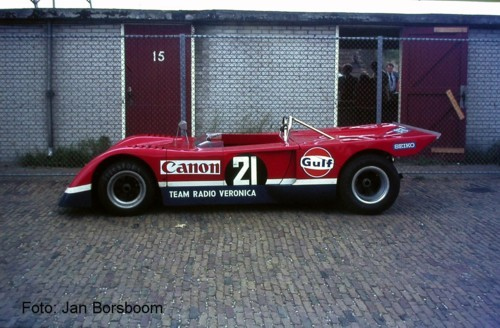 The Team Radio Veronica Chevron B19 of Theo Kinsbergen taken during the 1972 season. Copyright Jan Borsboom 2009. Used with permission. Ed Swart has checked his records and confirmed that he then loaned his car to Theo Kinsbergen (NL) for Dutch national sports car races. According to the Racingsportscars website, Kinsbergen drove it at Zandvoort 12 Mar, 3 Apr, 30 Apr, 22 May and 18 Jun; at Woensdrecht 16 Jul; and at Zandvoort again 6 Aug, 7 Oct and 8 Oct.Martin Fokkens has kindly allowed this image to be used from his fascinating racehistorie.nl website. The car was then sold to Peter Wright (Huntingdon, Cambridgeshire) in England, matching Swart's recollection that it was sold to someone in England. Wright was the designer and aerodynamicist who would later work on the Lotus 78 but in 1973 was at Specialised Mouldings, based on Huntingdon Trade Estate, who did the bodywork for the Chevron sports cars. He advertised the car in Autosport on 8 Feb 1973, an "ex Team Canon car Dutch National championship" car. On 29 Mar 1973, Wright advertised the car (p56) from an evening number in nearby Elsworth saying that it was a "Chevron B19 1800cc FVC", an "ex-Canon team car" and was "unused since chassis rebuild at John Burton Racing". He advertised it again from Huntingdon throughout August 1973.
