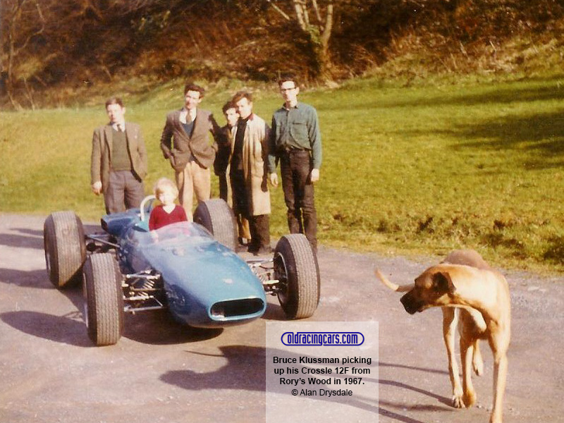 Bruce Klussmann picking up his Crosslé 12F at the factory in 1967. Behind and in the car from left to right are Leslie Drysdale, Henry and John Crosslé, Alfie Wilson, Ian Drysdale and Bruce Klussmann. Copyright Alan Drysdale 2010. Used with permission.