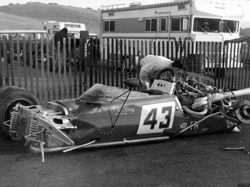 A picture of a wrecked LT20 seems somehow apt. But this is not one of the UK wrecks, it is Phil Henny's car after his accident at Laguna Seca in 1971. Note that it has been retrofitted with LT22 rear suspension. Copyright Phil Henny 2003. Used with permission.