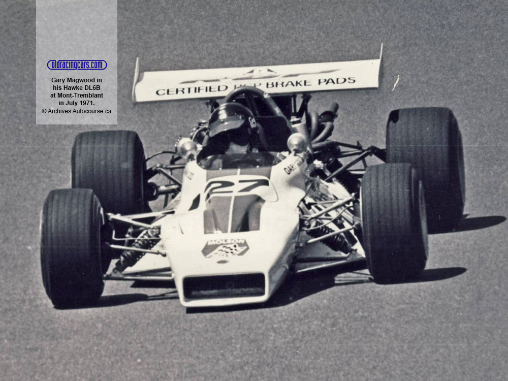 The Hawke DL6 was built in DL6A specification for British Formula Atlantic and DL6B specification for Canadian Formula B. Gary Magwood was Hawke importer for Canada, but made enough negative comments about his own car to ensure it had very limited sales.